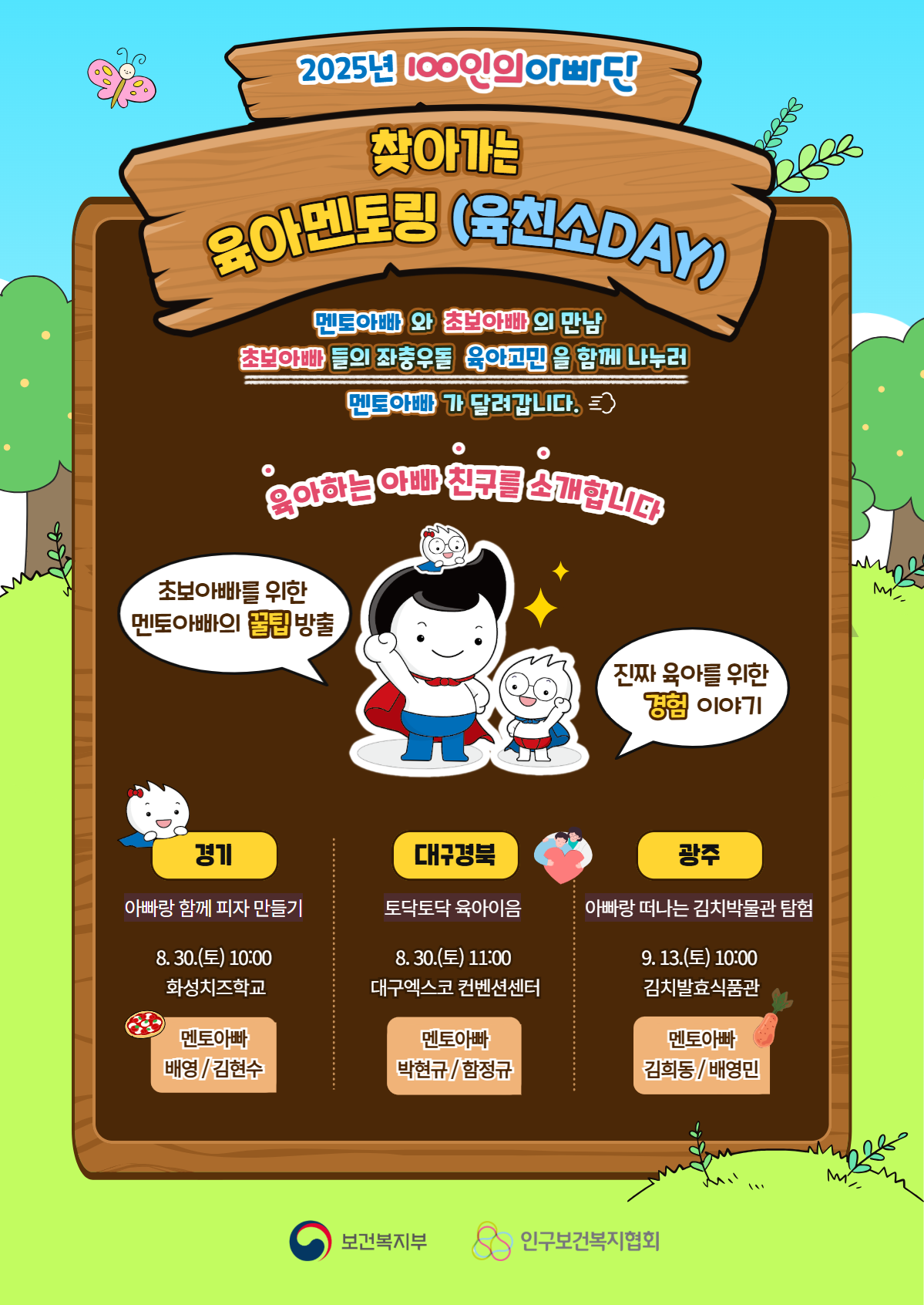 보건복지부(장관 정은경)와 인구보건복지협회(회장 이삼식)는 8월 30일(토), 9월 13일(토) 경기, 대구, 광주 등 전국 3개 지역에서 전국 ‘100인의 아빠단’을 위해 ‘찾아가는 육아 멘토링(육친소DAY*)’을 개최한다.
